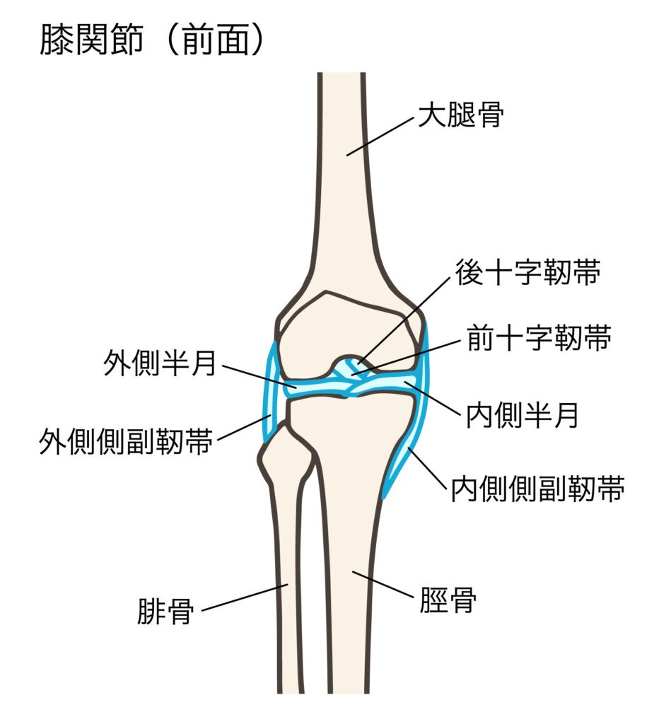 膝関節内の靭帯は4つ存在し、それぞれ内側側副靭帯、外側側副靭帯、前十字靭帯、後十字靭帯と名付けられています。