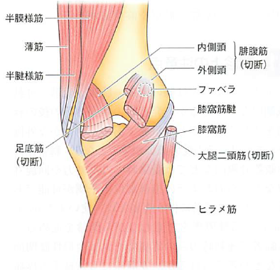 膝関節の後方ですが、大腿骨の後面に付着している筋肉が多く、足関節の方向に伸びる筋肉がほとんどになります。大腿骨は後面に足底筋や下腿三頭筋を認めております。なお、脛骨側は鵞足、膝窩筋、大腿二頭筋が大腿骨側に伸びております。