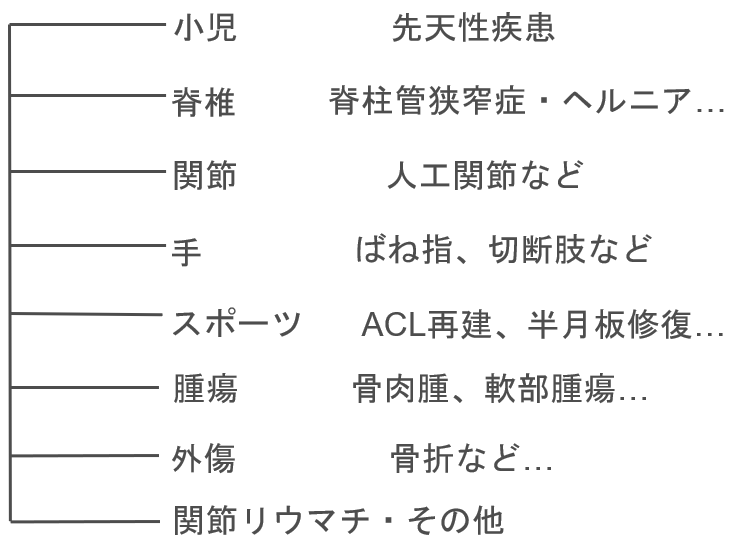 小児整形外科以外の分野としては脊椎外科、関節外科、手の外科、スポーツ整形外科、腫瘍、外傷、関節リウマチなど代謝性疾患の分野と細かく分かれております。